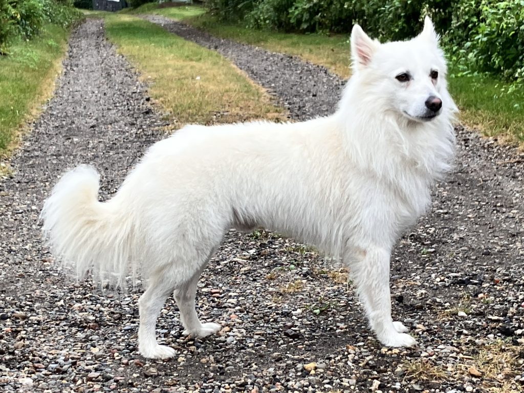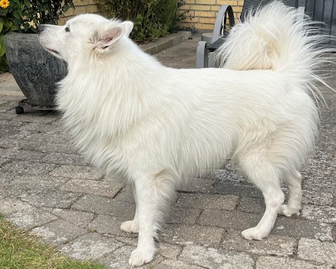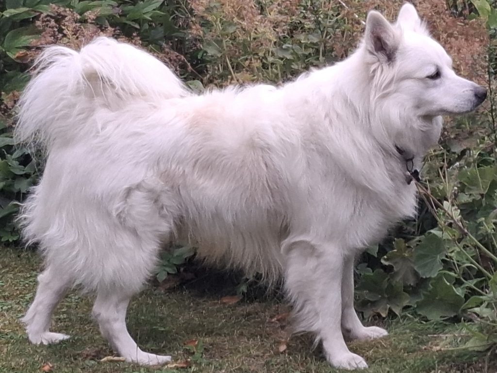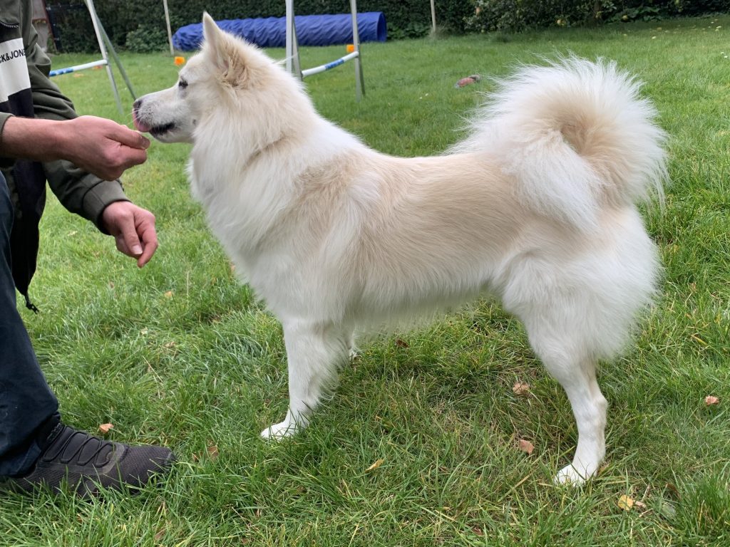 størrelse 51 cm, stor, typisk spidshund, må ikke være større, kvadratisk krop, til tider effektive bevægelser, lidt kort næseparti, en anelse groft hoved, som savner kileform, let hvælvet skalle, udmærket øjenbensbuer, tilstrækkeligt markeret stop, lige næseryg, lidt for løse læber, men velpigmenteret, stærke kæber, kraftigt tandsæt, saksebid, korrekte kinder, middelstore øjne, roligt bilk, mørke øjne, som er ovale, noget vidt ansatte og båren ører, tilstrækkelig halslængde, skal have mere nakkebue, må ikke have mere halshud ved struben, acceptabel kropslængde, lidt affaldende overlinje, middellang ryg, en anelse lang lænd, udmærket opkneben bug, højt ansat oprullet hale, lige muskløse forben, en anelse kort overarm, acceptabel bevægelse for og korrekt bag, dækpelsen skal være bedre tilliggende, acceptabel farve, dejligt temperament,