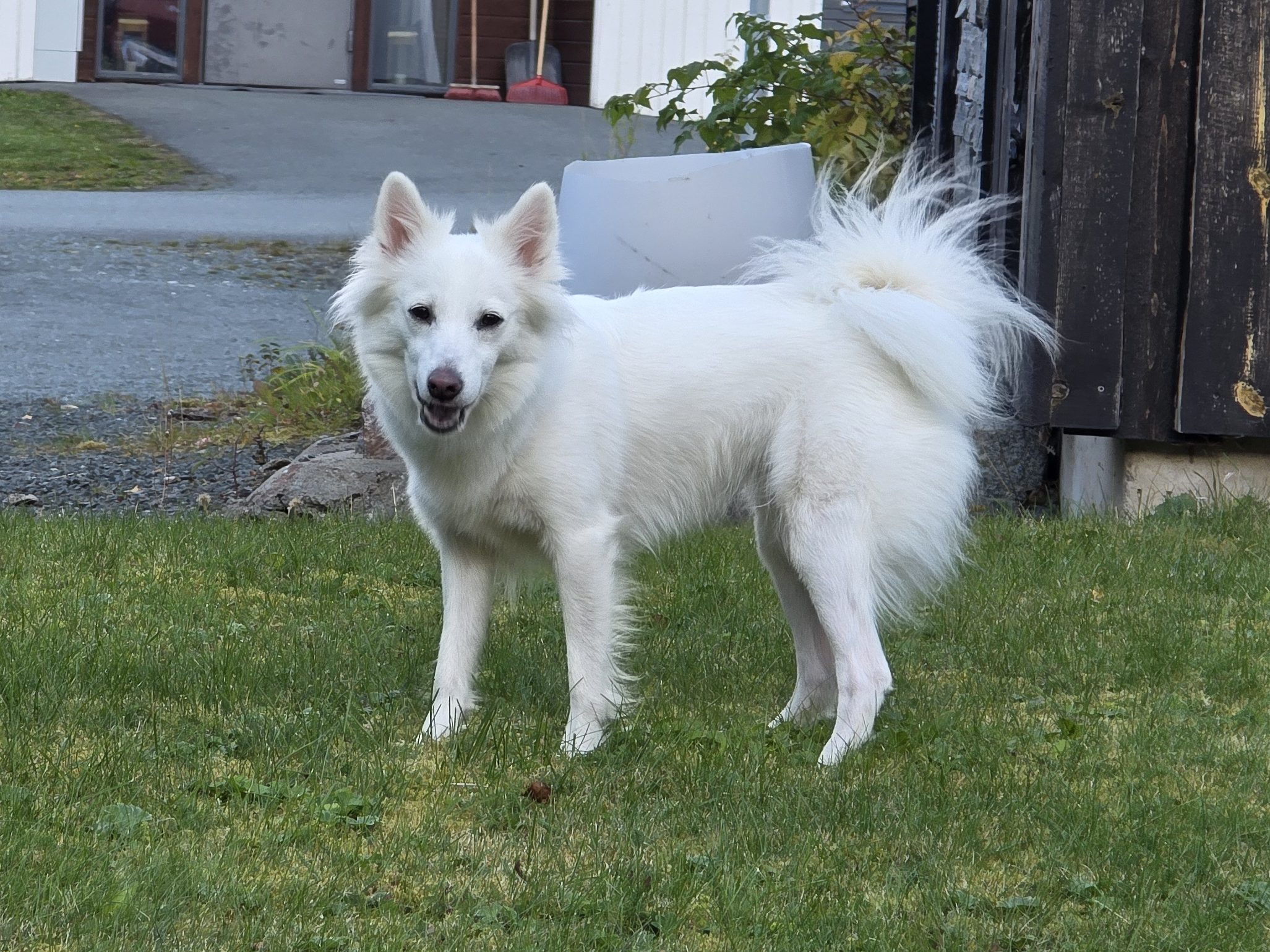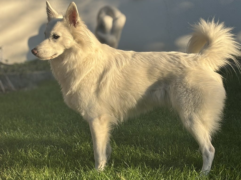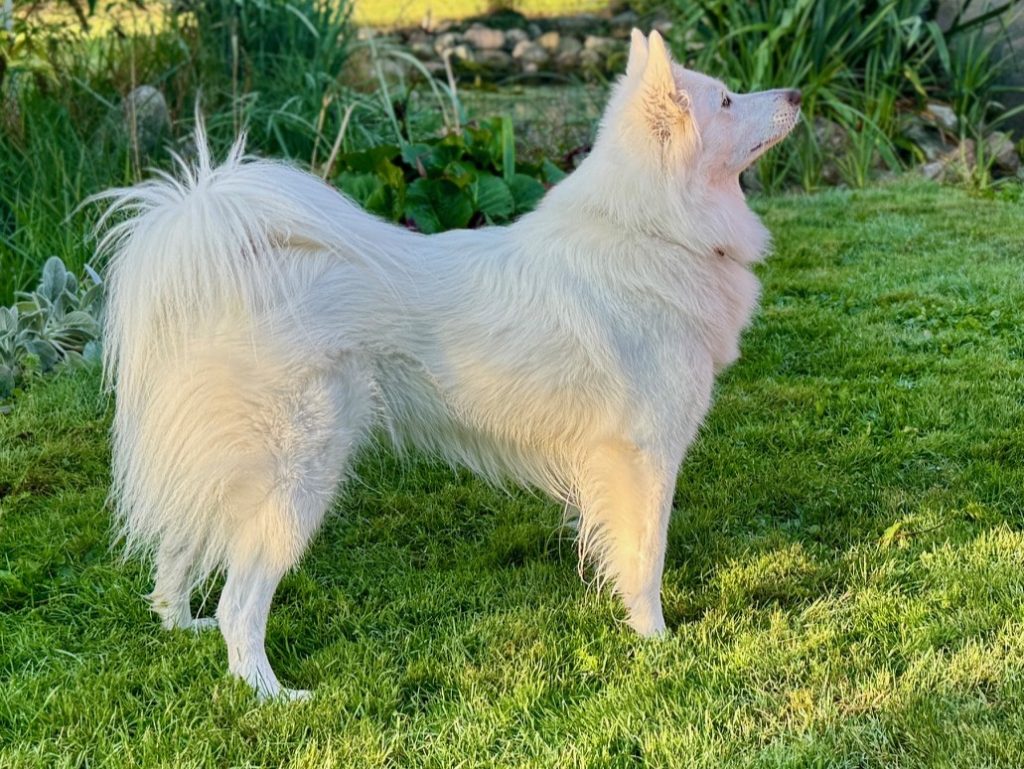 bredere underkæbe; korrekt saksebid med store tænder; korrekt buet nakke og stærk hals; velvinklet skulder; god længde på en anelse stejl overarm; tilstrækkeligt forbryst; tilliggende albuer; velformet, dyb og tilpas rummelig brystkasse; stærk lige ryg; stærk kort lænd; korrekt kort og let hældende kryds; velansat og -båret hale med tilpas behåring; velvinklet bag; prima lave haser; gode benstammer; ovale knyttede poter med gode puder; står en anelse fransk fortil; tilliggende sommerpels af prima mængde (den er meget fyldig om vinteren ifølge ejer); pelskvaliteten er lidt blød; prima offwhite farve; bevæger sig effektivt, let, parallelt og udholdende set fra alle sider – dog en anelse trangt bag. Herligt nysgerrigt, venligt og velafbalanceret temperament.